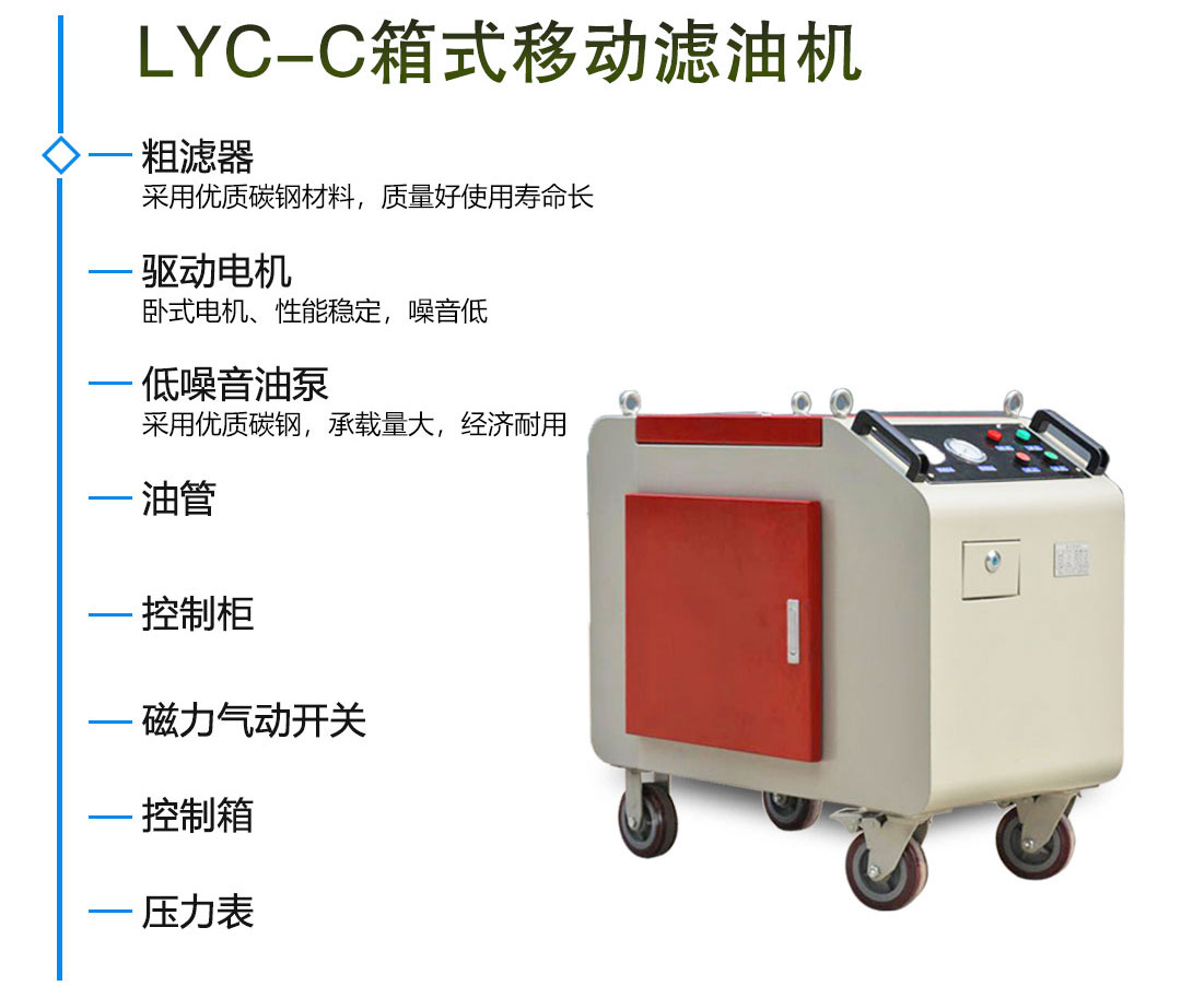 LYC-C箱式移動濾油機系列采用精制外殼包覆所有元件,保護設備免遭外界污染,尤其適應于對使用環境要求高的場所,該濾油機包括一個由電機驅動的專用齒輪泵,具有噪音低、自吸能力強,運轉平穩等特點。高壓管路設有溢流保護裝置,可有效保護液壓系統的安全。采用熱繼電器保護,防止電機過載所造成的電機損壞。吸油口粗過濾器保護油泵,并延長主過濾器的使用壽命。泵后設有兩級精過濾器,使油液快速達到很高的清潔度。精過濾器可根據用戶的不同需要,選擇不同的精度,達到所需要的要求。濾油器殼體采用快開結構,不需要任何工具,便能迅速快捷地打開上蓋,更換濾芯。面板上裝有壓力表,在工作時,連續指示出系統的運行狀況和濾芯的污染程度。