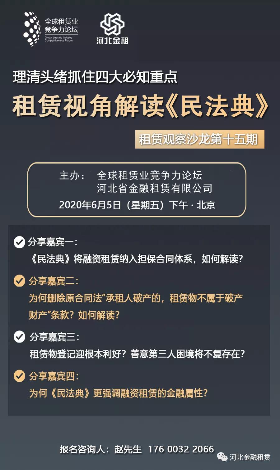《中華人民共和國民法典》近日正式公布,標志我國“民法典時代”到來。《民法典》涉及多項與融資租賃密切相關的法律條款,擴大了動產擔保合同的范圍,將融資租賃納入擔保合同,將對融資租賃業的經營活動產生深遠影響。 6月5日下午,全球…